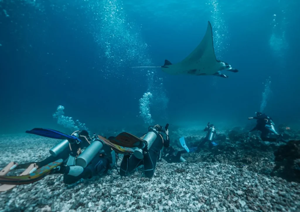 Manta rays are commonly seen at sites like Manta Point, where nutrient-rich currents attract them year-round. On calm days, guests can snorkel alongside these large but gentle animals as they glide through the water.