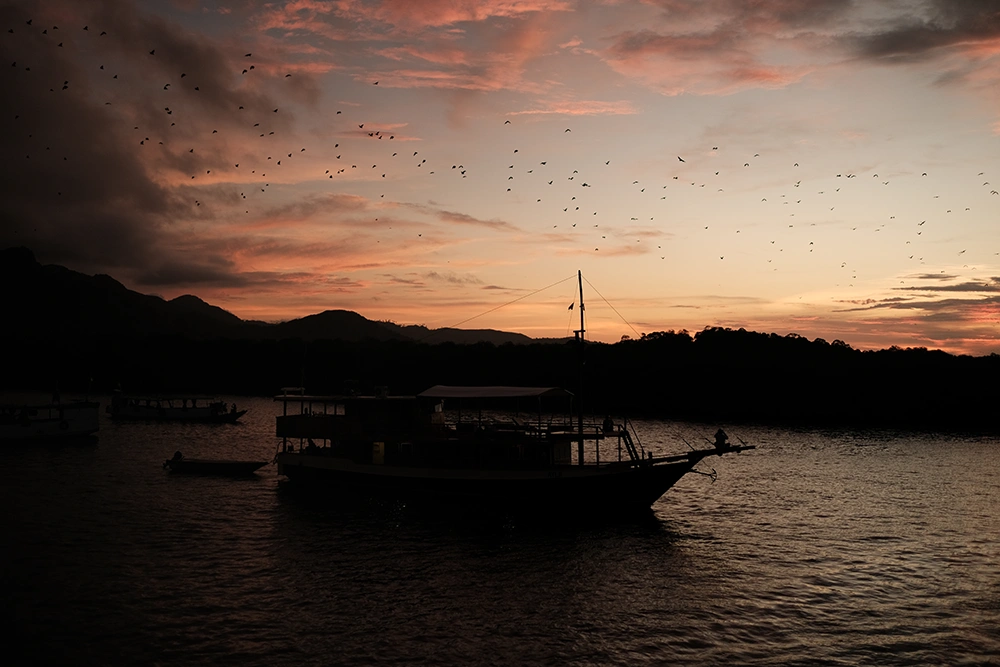 Not all encounters happen in the water or on land. While sailing between islands, guests often spot flying fish, dolphins, and seabirds from the deck. At sunset near Kalong Island, thousands of fruit bats (flying foxes) leave the mangroves in dramatic formations—one of the most memorable moments of a Komodo cruise.