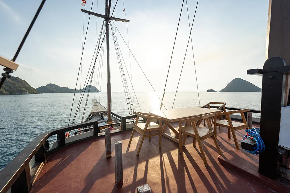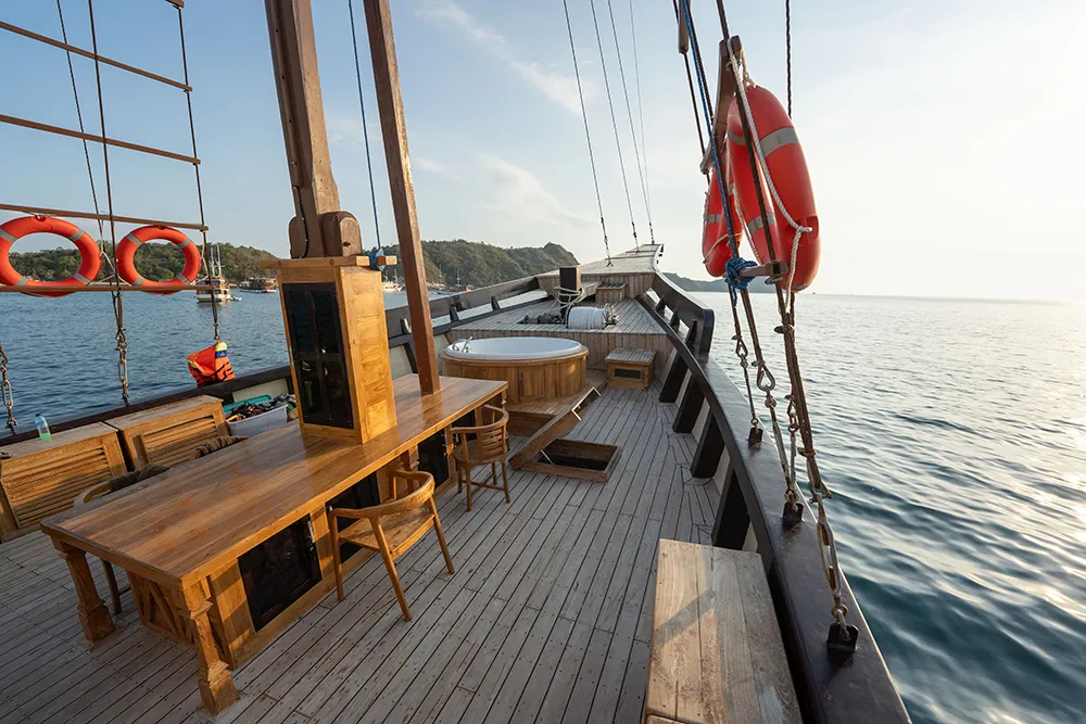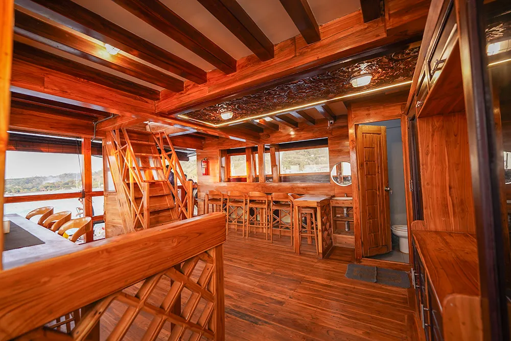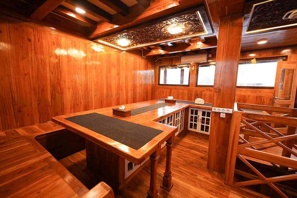 Al Fathran 3 is a larger Phinisi built to host more passengers while still offering comfortable shared areas. The onboard atmosphere is more social, with guests spending time on the sundeck, chatting during meals, and often forming small groups throughout the trip.