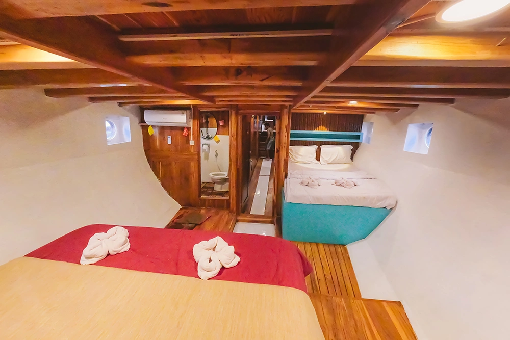 The boat offers a wider range of cabin configurations, including cabins designed for groups and two shared dorm-style rooms. This flexibility makes it easier for groups of friends, families, or travelers with different budgets to join the same cruise. All cabins are air-conditioned, and Private cabins have private bathrooms. Only dormitories have to use a shared bathroom.