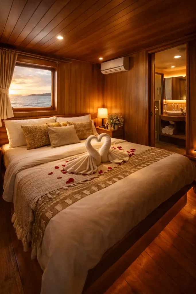 In deluxe and luxury Phinisi boats, couple cabins may also include elegant décor, soft lighting, and cozy spaces ideal for relaxation after a day of island adventures.