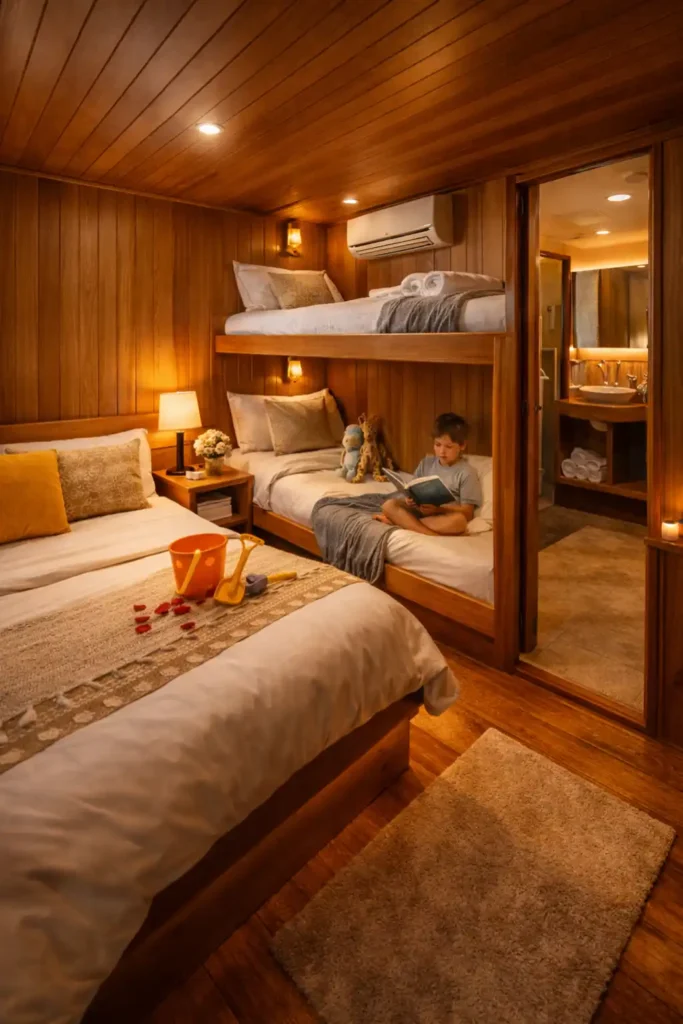 Family cabins are spacious and thoughtfully arranged, offering multiple beds (double + single or bunk beds) within one room. These cabins provide privacy and convenience for parents and children, often equipped with private bathrooms, storage, and A/C.