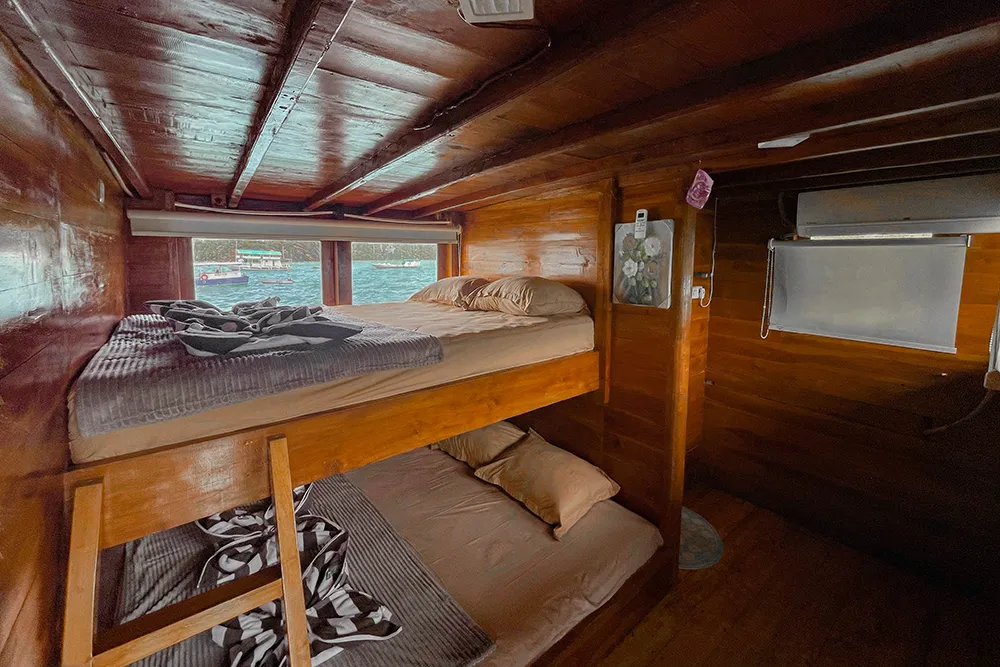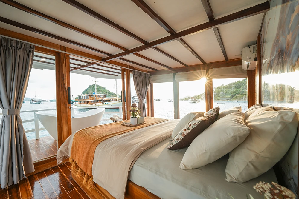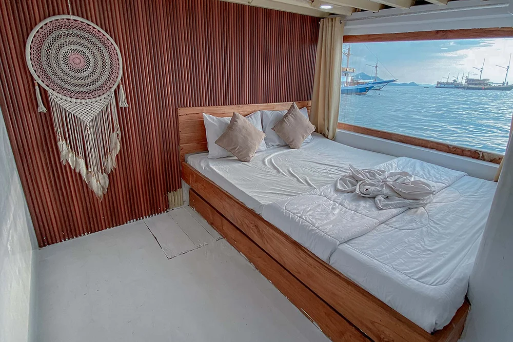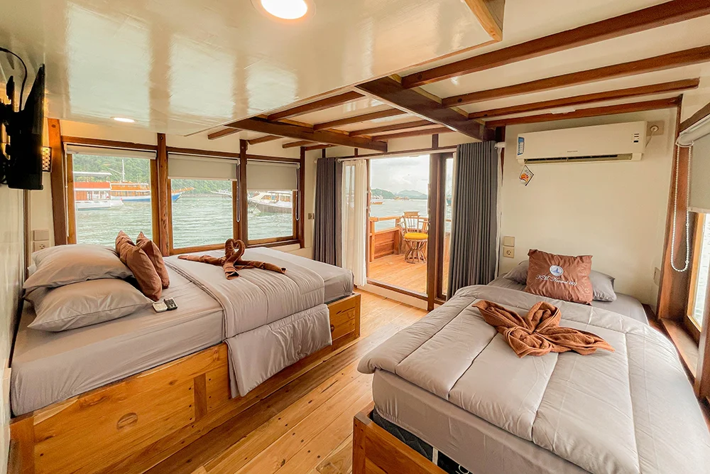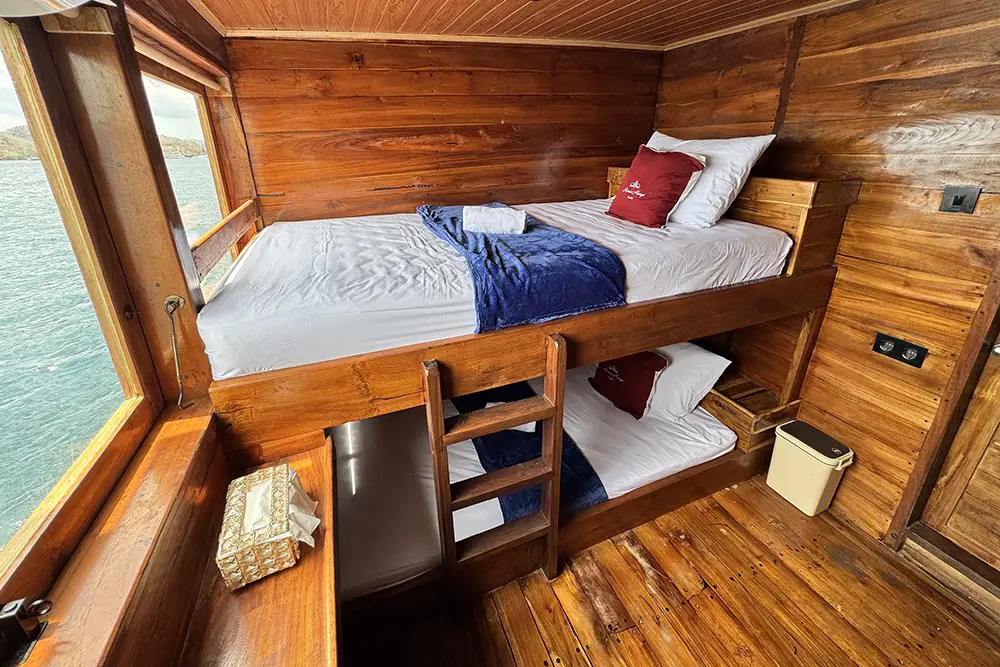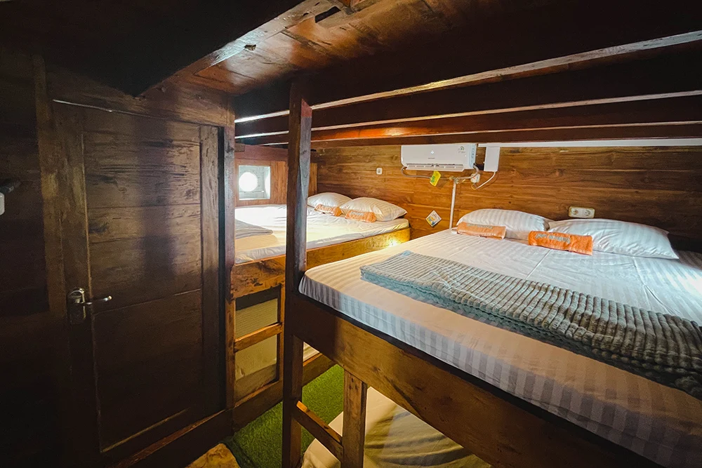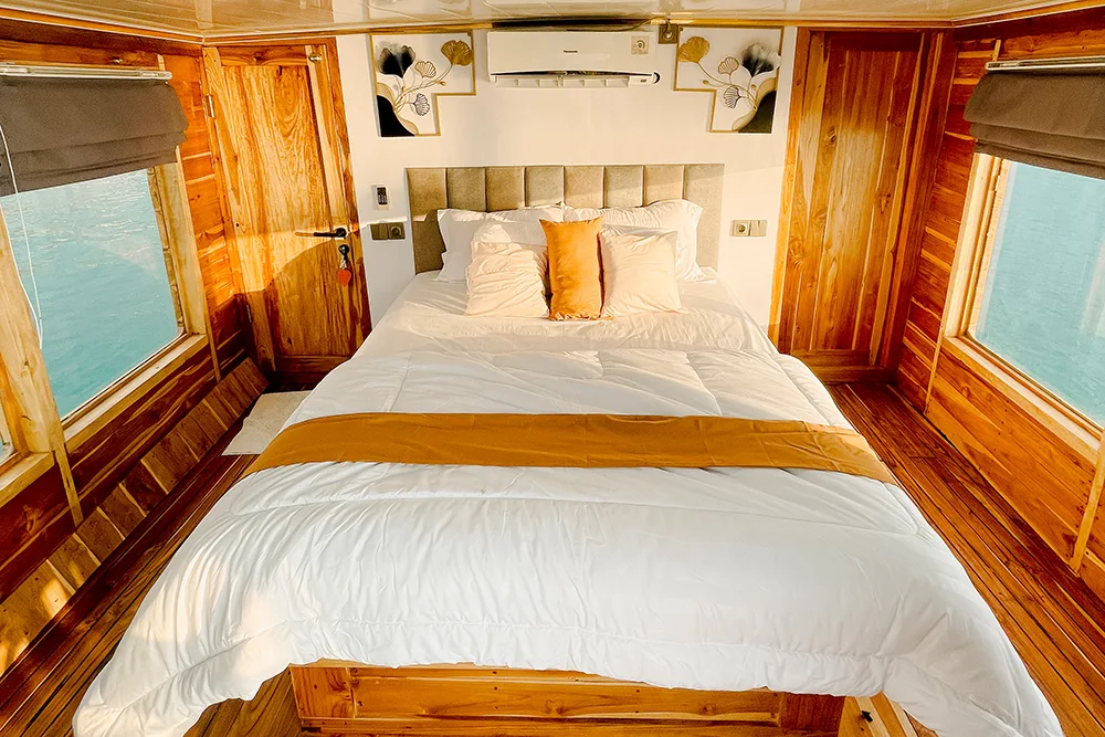 Each Phinisi boat offers a variety of cabins designed to suit every type of traveler — from solo adventurers to honeymooning couples and families seeking shared comfort. All rooms are crafted with warm wooden interiors that reflect traditional Indonesian charm while providing modern comfort.