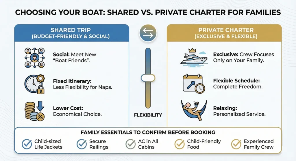 A private charter, while more expensive, gives you complete freedom. You decide how long to stay at a beach, whether to skip a hike, or when to have meals. The crew focuses only on your family, which makes the trip more flexible and safer. Parents usually find this option far more relaxing.