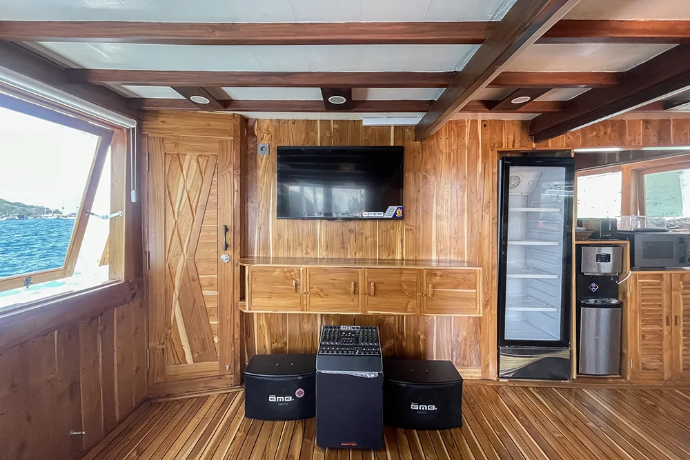 Soe Besar Vanrei is built in the traditional phinisi style, using strong wooden construction with modern interior upgrades. The layout is planned to give guests both social and private spaces.