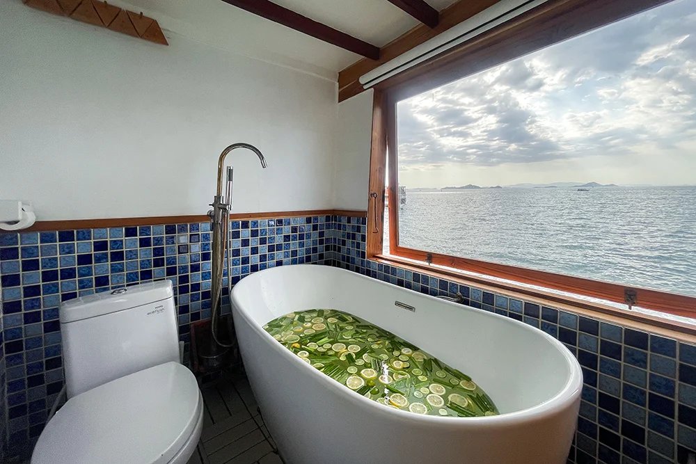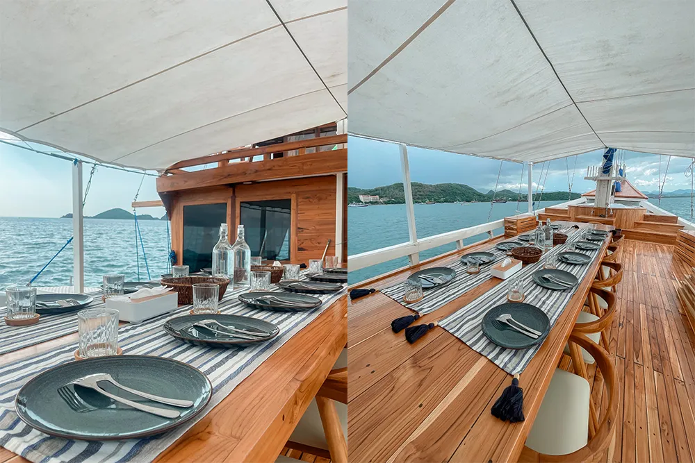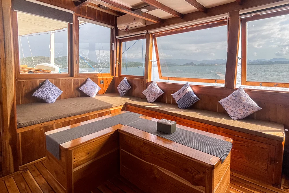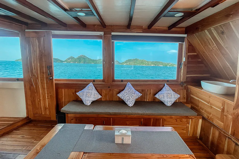 The indoor dining area is set up to be practical and comfortable, so meals can be served safely even when the sea is slightly rough.