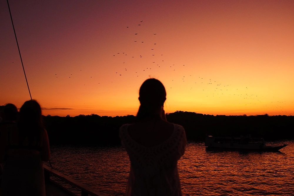 As dusk fell on our final day, we anchored near Kalong Island. It seemed like nothing, just a dense, unremarkable tangle of mangroves. The sky, however, was putting on a show, turning a violent orange and purple. We sat on the deck, drinks in hand. Then, as if summoned by the sunset, a single black wing took to the sky. Then a dozen. Then a hundred. Then a thousand. Within minutes, the entire sky was a swirling, beating river of giant fruit bats, a million wings against the twilight, streaming out from their mangrove roost to feed on the mainland of Flores. We sat in stunned silence, drinks forgotten in our hands, completely, utterly speechless, witnesses to a primal, nightly migration