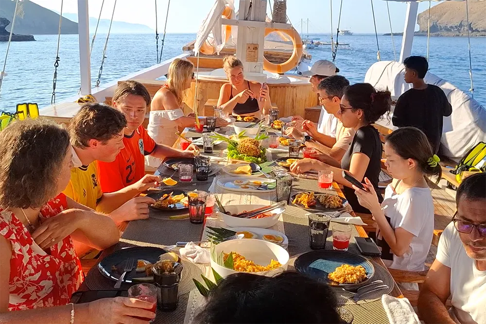 Life on board was a study in blissful “in-between” moments. It was reading a book on a giant beanbag on the sundeck, the sun warm on our skin, the wind drying the salt from our hair. It was dangling our feet off the bow, watching the water rush by, a mesmerizing, hypnotic blue. It was the communal hearth of the wide, open-air dining table, a place where we, a rambling collection of strangers from Spain, Australia, and Jakarta, became a sun-kissed, laughing family. We passed around heaping plates of nasi goreng, shared Bintang beers as the sun went down, and traded stories from our lives back in the “real world,” which already felt a million miles away.